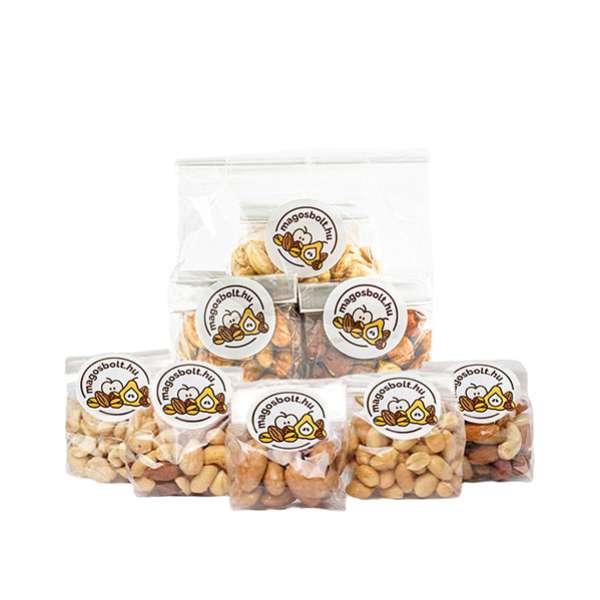 Termékösszetétel: 5 dkg kesudió (natúr) 5 dkg sótlan pörkölt földimogyoró 5 dkg natúr magmix (Öszetevők: mandula, tisztított mandula, törökmogyoró, kesudió, paradió.) 5 dkg sós magmix (Összetevők: törökmogyoró, héjnélküli és héjas mandulák, kesudió és földimogyoró.) 5 dkg karamellás mandula (a termékek összetevői, tápértékei és származási helyei a termék linkre kat...